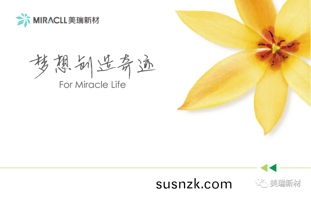 美瑞新材料股(gu)份有(you)限公司(si)(股票代码(ma):300848),是国(guo)内知名的聚氨酯材料(TPU、PUR、PUD、PU预聚(ju)体等)及全生物降解类材(cai)料(PBS等(deng))生产企业和国家高新技术(shu)企业。产品广泛应用于3C电子、医疗健康、个人(ren)护理、汽车制造、运动休闲、工业装备、绿色能源、家居生活、3D打印(yin)等领域。