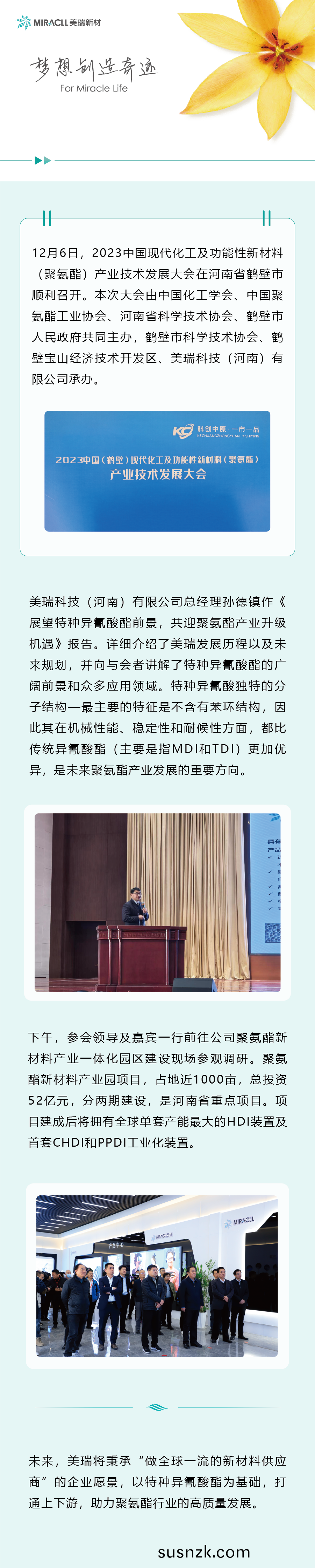 美瑞(rui)新材料股份有限公(gong)司(股票代码:300848),是国内领先的聚氨酯材料(TPU、PUR、PUD等)、功能化工品原料(特种异(yi)氰酸酯(zhi)、特(te)种胺等)及全生(sheng)物降解类(lei)材料(PBS等)生(sheng)产企业和国家高新技术企业。产品广泛应用于3C电子、医疗健(jian)康、个(ge)人护理(li)、汽车(che)制造、运动休闲、工业(ye)装备、绿色(se)能源、家居生活(huo)、3D打(da)印等(deng)领域。