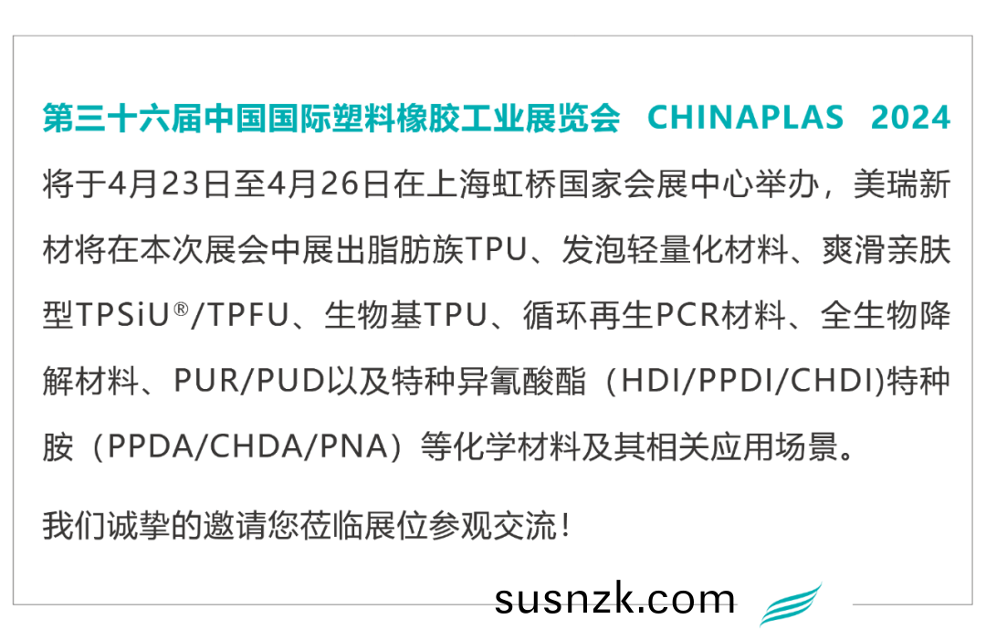 美瑞新材料股(gu)份有限公司(股(gu)票(piao)代码:300848),是国内(nei)领先的聚氨酯材(cai)料(TPU、PUR、PUD等)、功能化工品原料(特种异氰酸酯、特种胺(an)等)及全生物降解类材料(PBS等)生(sheng)产(chan)企业和国家高新技术企业。产品广泛应用于3C电子、医疗健康、个人护理(li)、汽车制造、运动休闲、工业(ye)装备、绿色能源、家居生活、3D打印等领域。