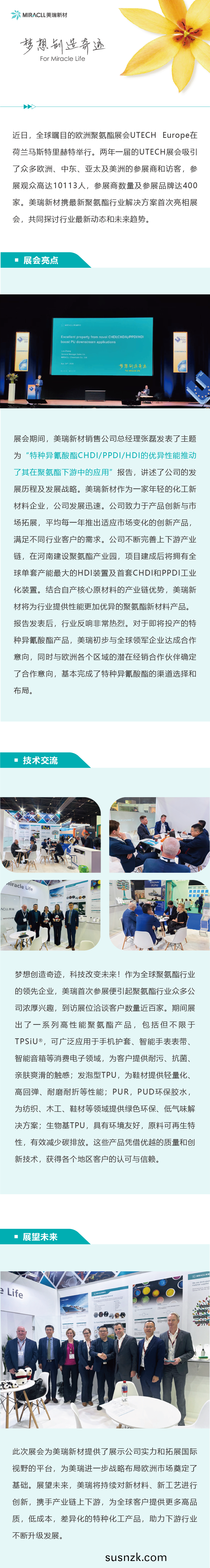 美瑞新材料股份有(you)限公司(股票代(dai)码:300848),是国内知名的聚氨(an)酯新材料(TPU、PUR、PUD、PBS)及功能化工品原(yuan)料(特(te)种异氰酸酯、特种胺)生产企业(ye),产品广泛应用于消费(fei)电子、汽车制造、运动休闲、高端装备、绿(lv)色能源、家居生活、工(gong)业(ye)涂装、密(mi)封传动、3D打印、食品卫生等领(ling)域。