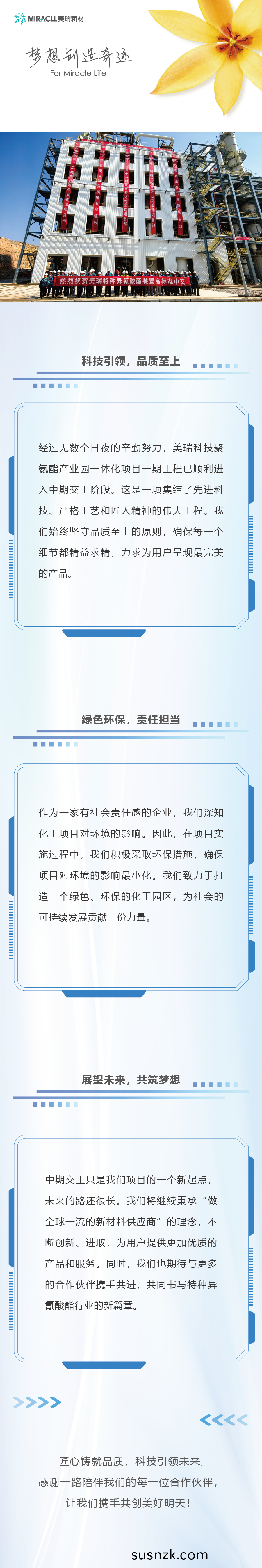 美瑞新材料股(gu)份有限公司(股票代码:300848),是(shi)国内知名的聚氨(an)酯新(xin)材料(TPU、PUR、PUD、PBS)及功能化工品原(yuan)料(特种异氰酸酯、特种胺)生产企业,产(chan)品广泛应用于消费电子、汽车(che)制造(zao)、运动休闲、高端装备、绿色能源、家(jia)居生活、工业涂装、密封传动、3D打印、食品卫生等领域。