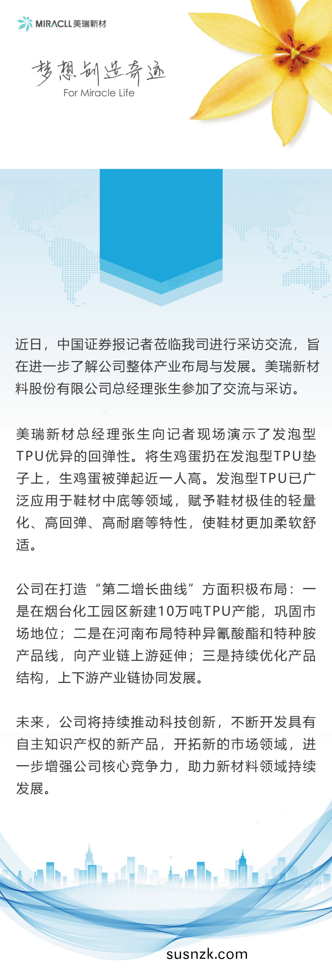 美瑞新材料股份有限公司(股票代码:300848),是国(guo)内知名的(de)聚(ju)氨酯新材料(liao)(TPU、PUR、PUD、PBS)及功能(neng)化(hua)工品原(yuan)料(特种异氰酸酯、特种(zhong)胺)生产企业(ye),产品广泛应用于消费电(dian)子(zi)、汽车制造、运动休闲、高端装(zhuang)备、绿色能源、家(jia)居生活、工业涂(tu)装、密封传动、3D打印、食品卫生等领域。