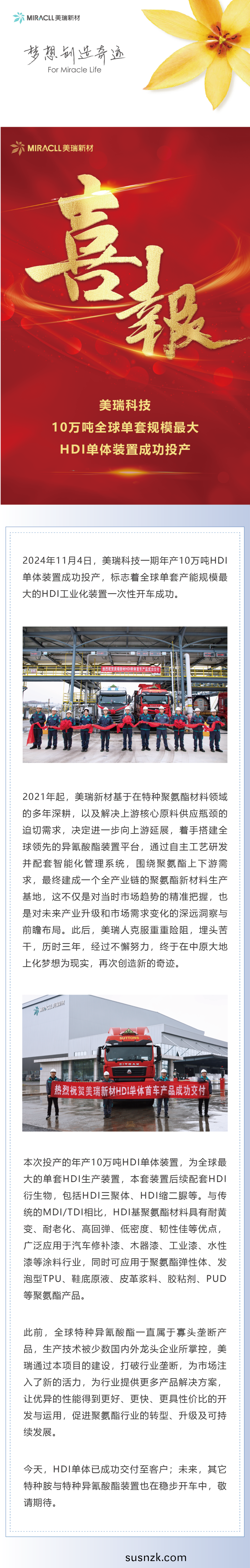 美瑞新材(cai)料股(gu)份有限公司(股票(piao)代码:300848),是国内知名的(de)聚氨酯新材料(TPU、PUR、PUD、PBS)及功能化工品(pin)原(yuan)料(特种异氰酸酯、特(te)种胺)生产(chan)企业,产品(pin)广(guang)泛应用于(yu)消费电子、汽车制造、运动休闲、高端装备、绿色能源、家(jia)居生活、工业涂装、密封传动、3D打印、食品卫生等领域(yu)。